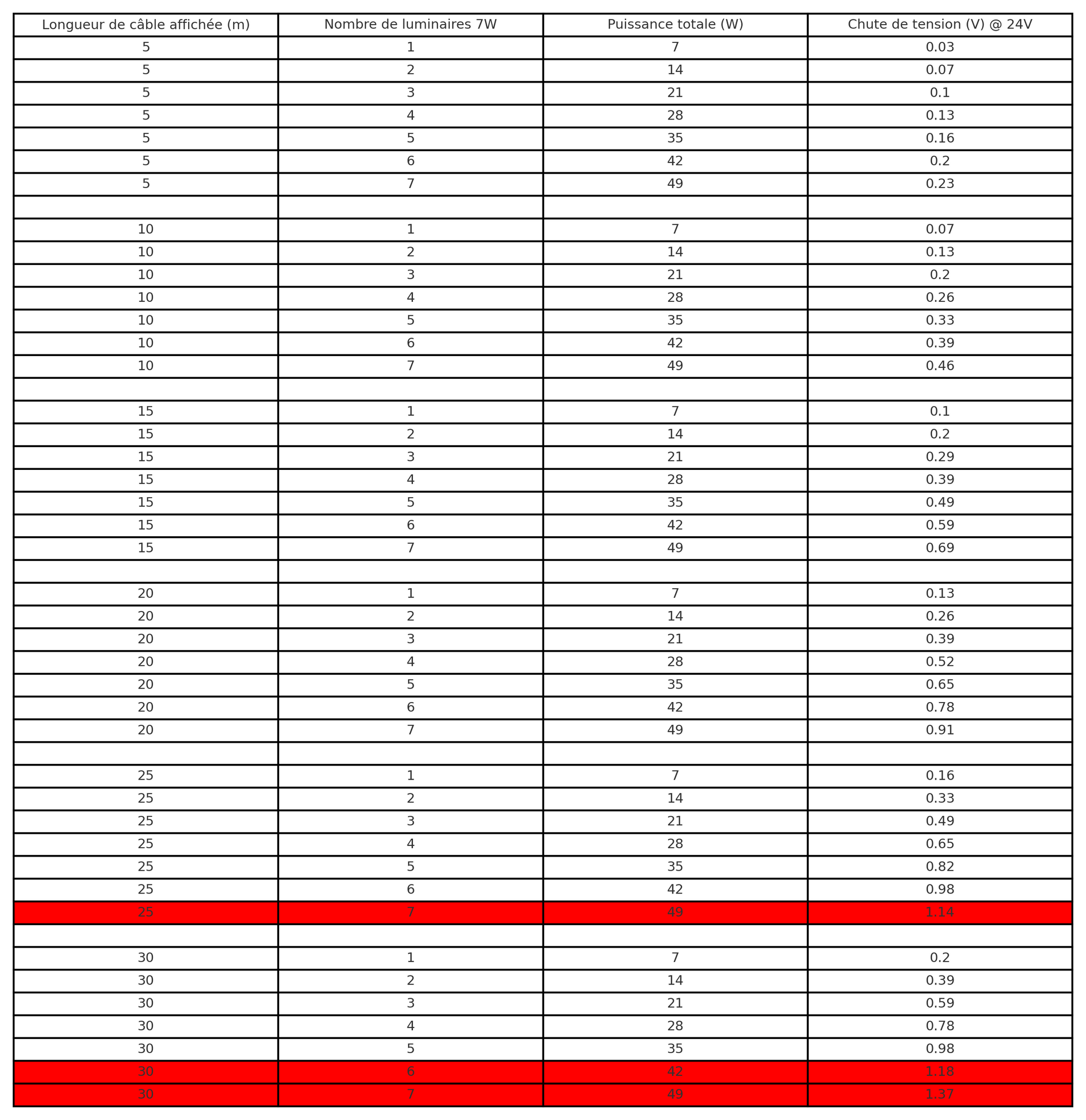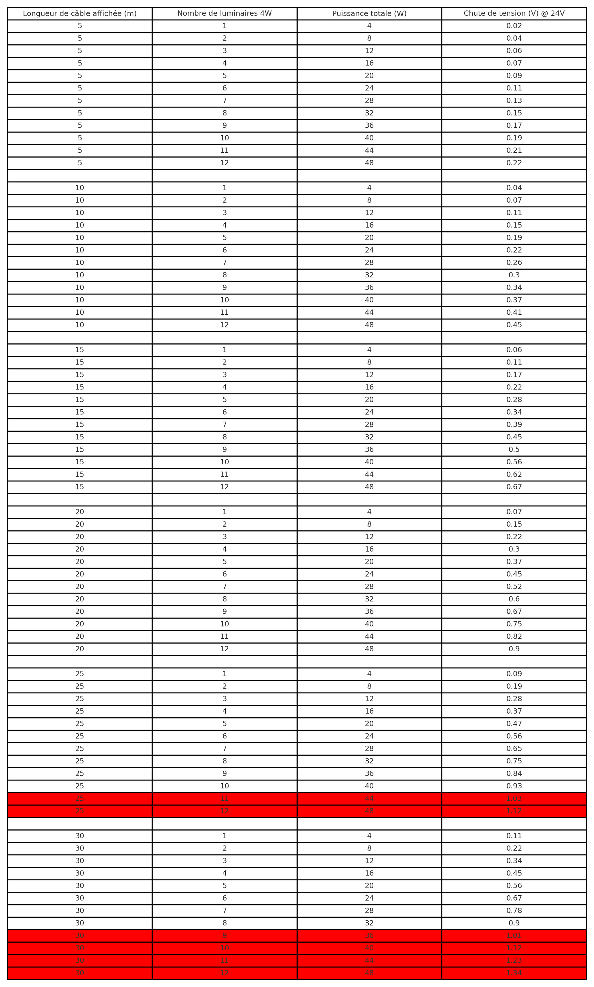 Suivre les tableaux dans les photos selon le type de luminaire. Eterna = 4W, Solis = 7W. Pour les lignes en rouges, l'installation n'est pas possible.